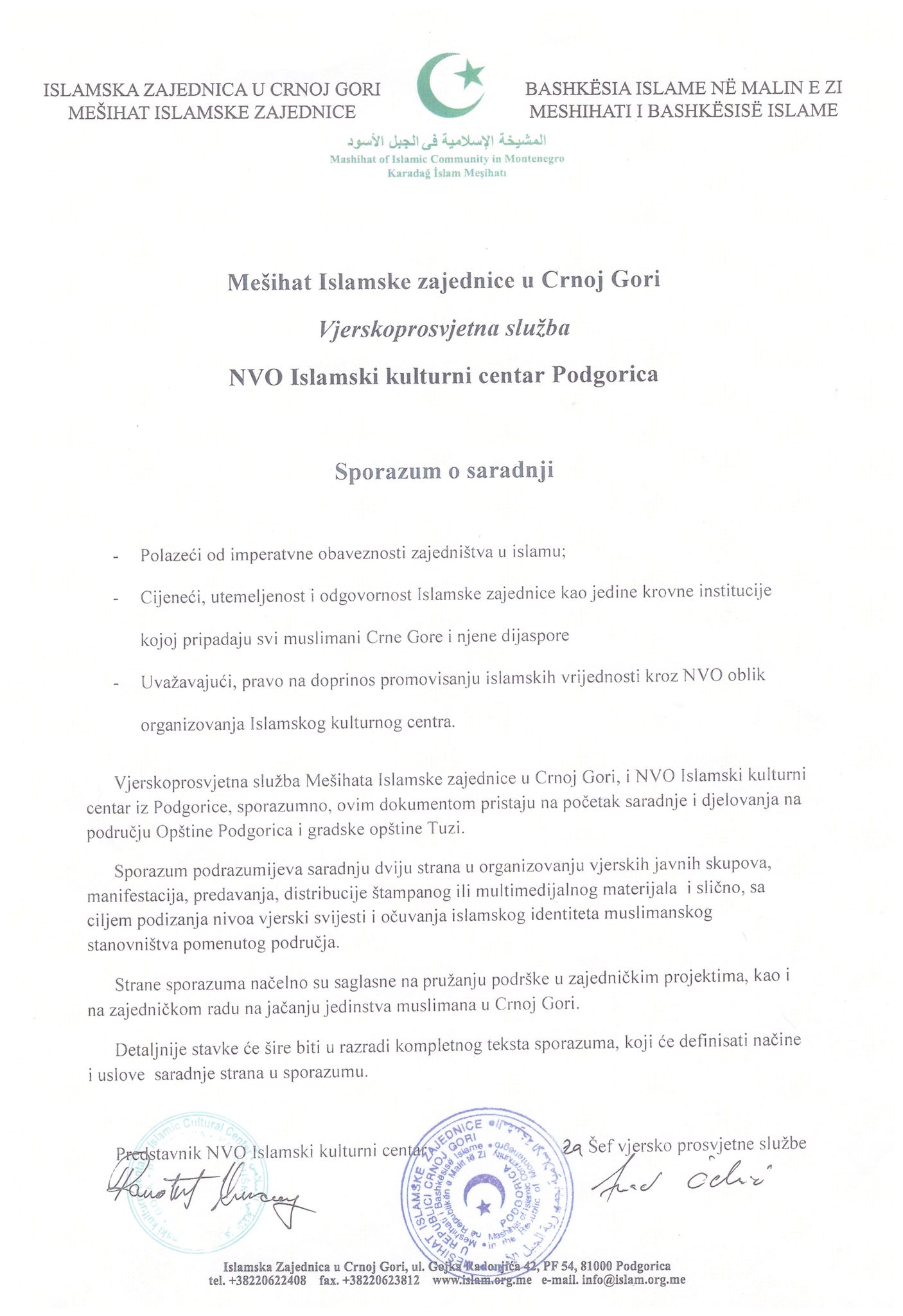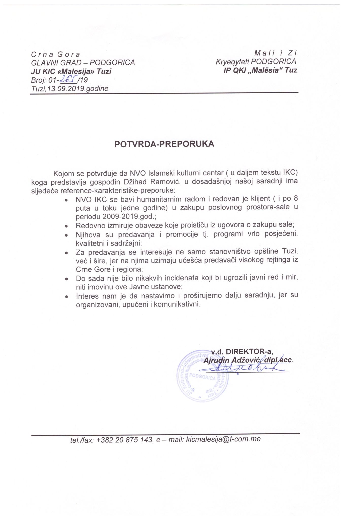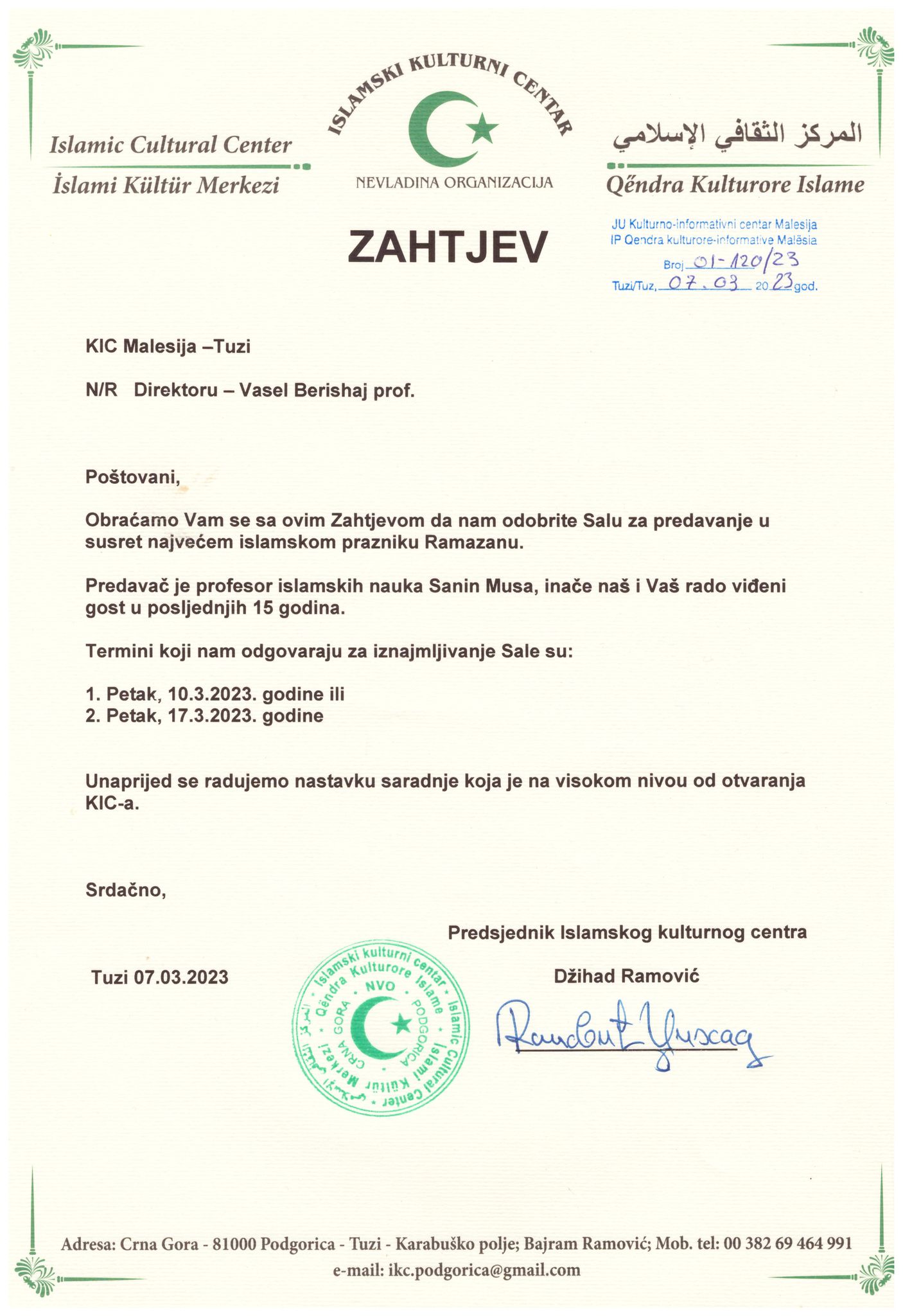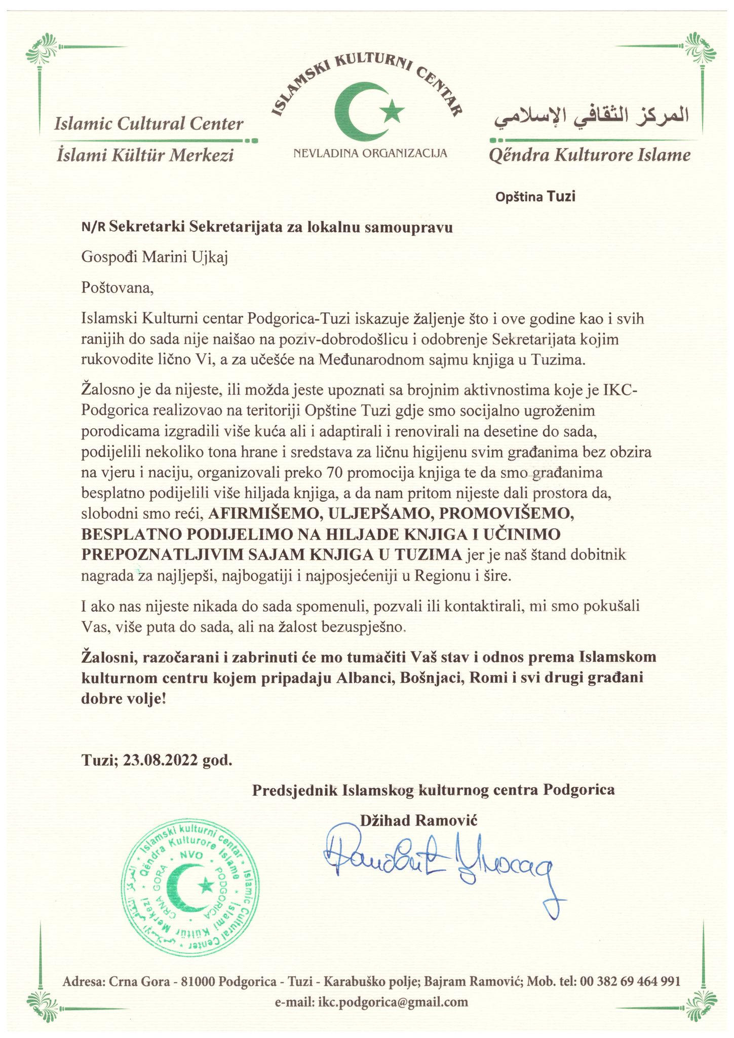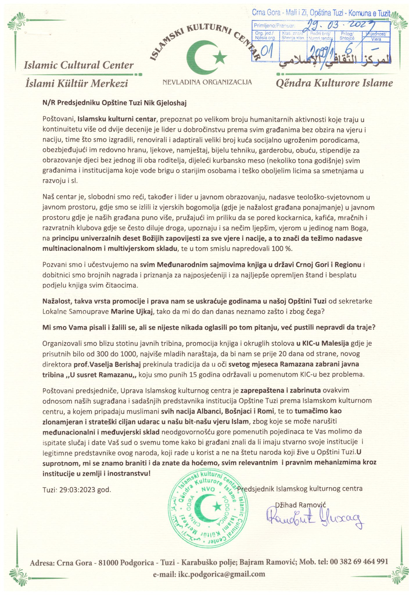 Poštovani predsjedniče, Uprava Islamskog kulturnog centra je zaprepaštena i zabrinuta ovakvim odnosom naših sugrađana i sadašnjih predstavnika institucija Opštine Tuzi prema Islamskom kulturnom centru, a kojem pripadaju muslimani svih nacija Albanci, Bošnjaci i Romi, te to tumačimo kao zlonamjeran i strateški ciljan udarac u našu bit-našu vjeru Islam, zbog koje se može narušiti međunacionalni i međuvjerski sklad neodgovornošću gore pomenutih pojedinaca te Vas molimo da ispitate slučaj i date Vaš sud o svemu tome kako bi građani znali da li imaju stvarno svoje institucije i legitimne predstavnike ovog naroda, koji rade u korist a ne na štetu naroda koji žive u Opštini Tuzi.U suprotnom, mi se znamo braniti i da znate da hoćemo, svim relevantnim i pravnim mehanizmima kroz institucije u zemlji i inostranstvu!